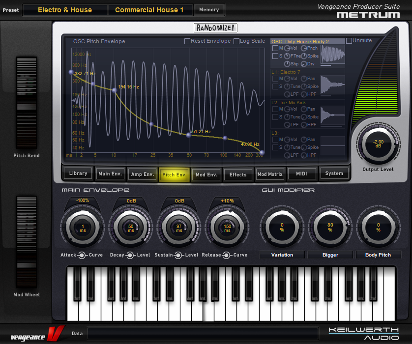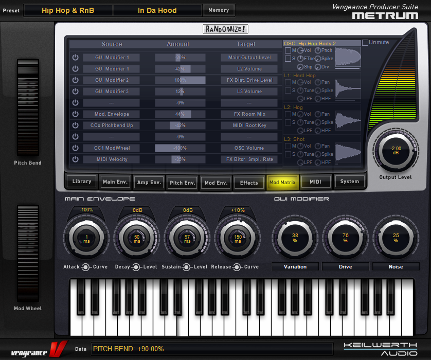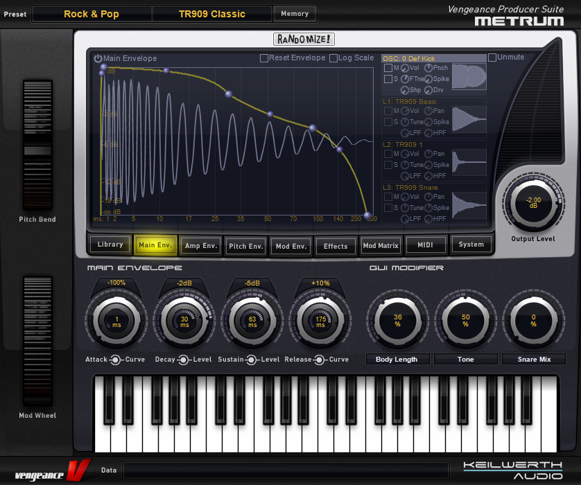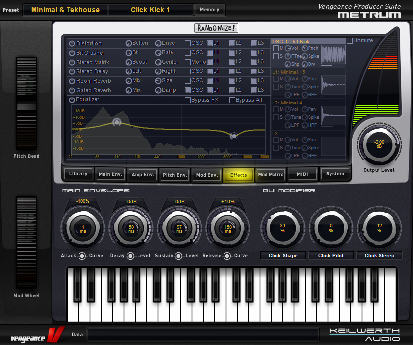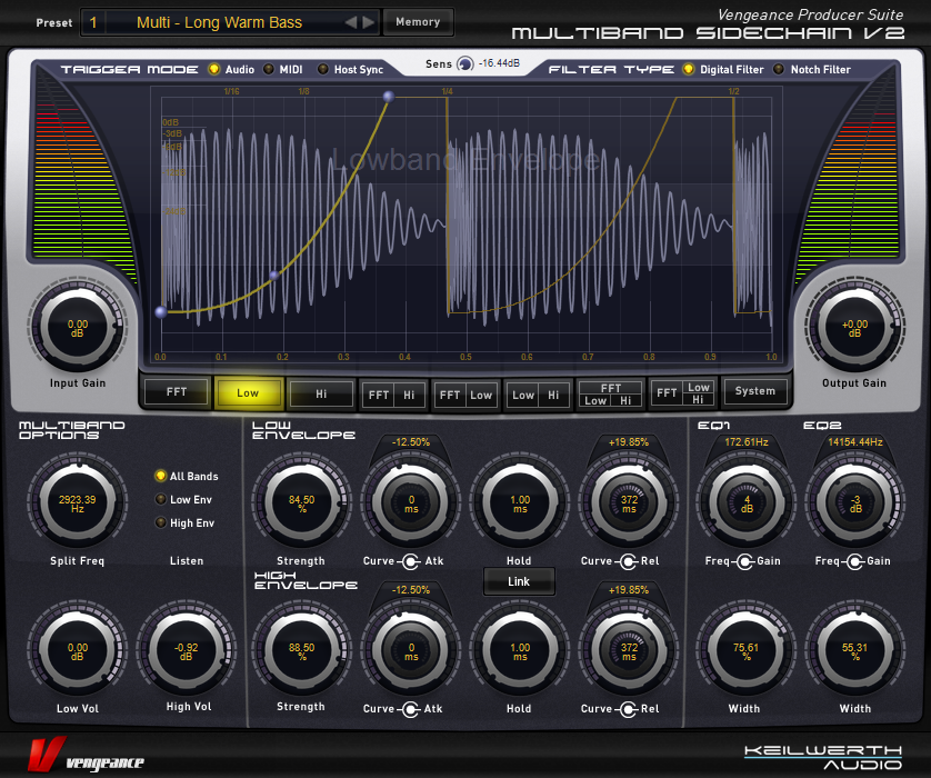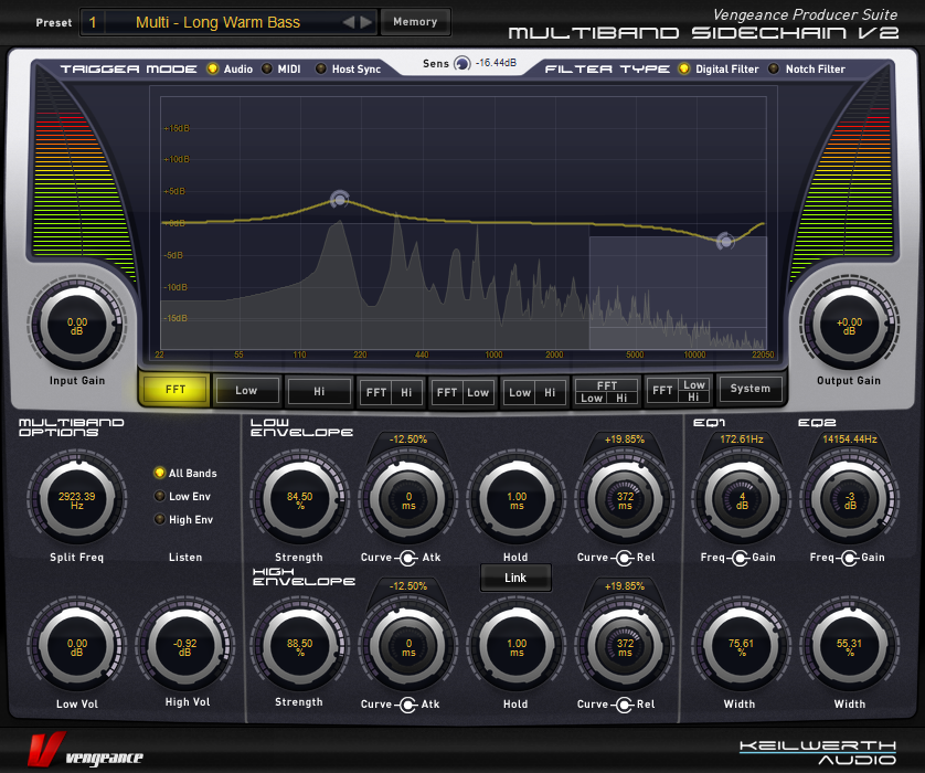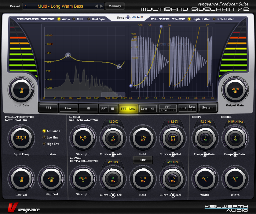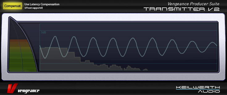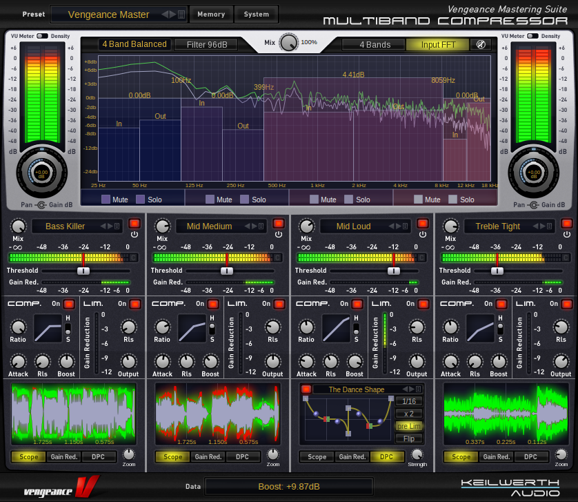 Vengeance-Sound MBC offers 4 full-spec compressors, each including an optional limiter, plus a master output limiter for the overall sum. Each compressor has independent threshold, ratio (1:1 to 1:infinity), soft- or hard-knee characteristic, attack, release and boost controls. MBC has a comfortable “Autogain” option, where any loss of level caused by the compression process is automatically compensated for. The number of compressors used can be freely selected – 1, 2, 3 or 4. These frequency bands are separated by first-rate filters with slope values ranging from 6db to 96db that, unlike standard filters, produce no phase artifacts whatsoever. Despite all these parameters, MBC includes top-notch optical feedback so you can understand what is going on at a glance: 2 FFT analysers (1 pre-compressor, 1 post-compressor) as well as a live oscilloscope for each band showing the audio signal before as well as after compression within the same display (colour coded). Furthermore, each band has its own input and output level display. The main large input and output VUs can be switched between standard and a “Density” view, which shows how strongly different levels of signal are compressed.